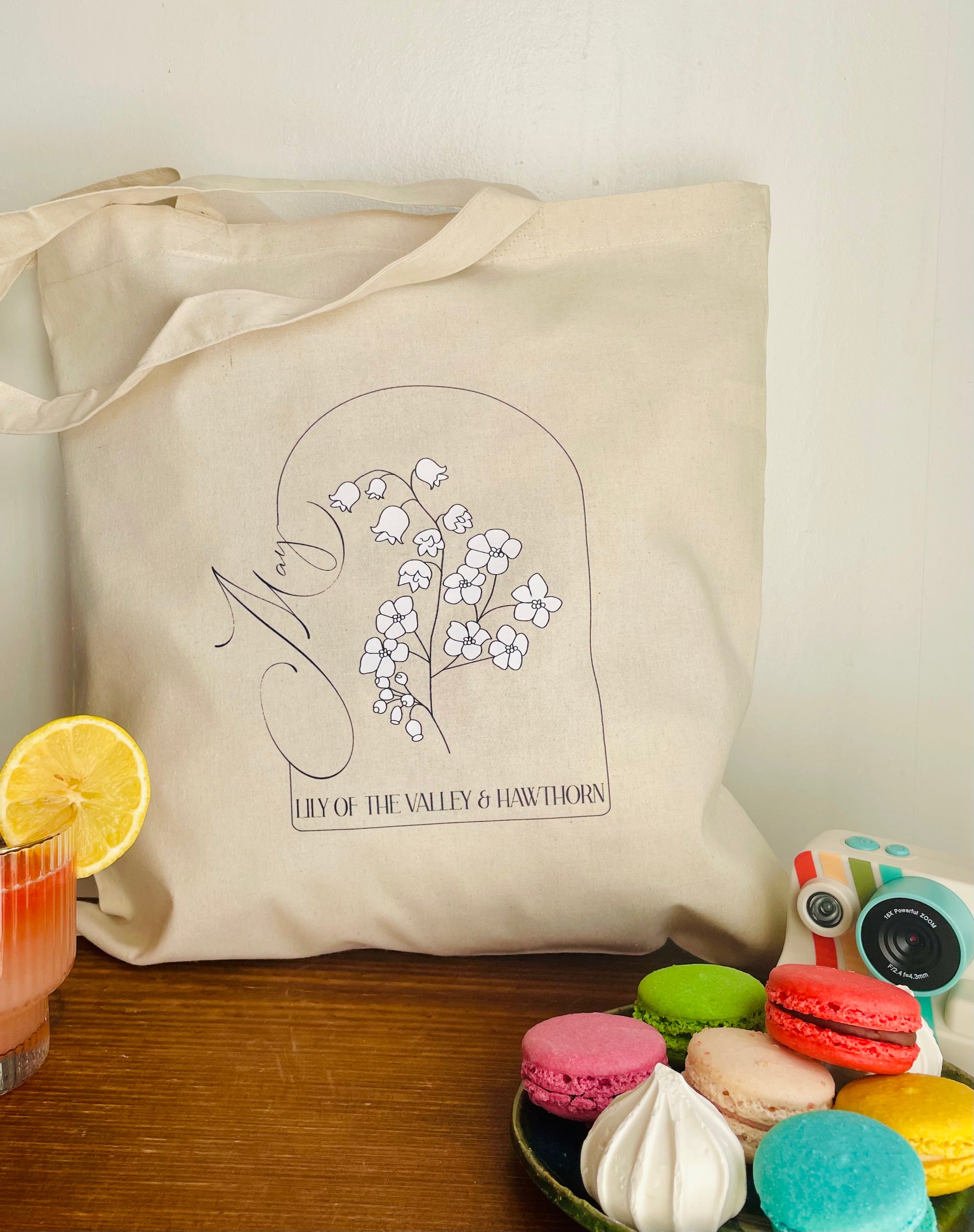 Made of durable canvas, this tote features May's birth month flowers of Lily of the Valley and Hawthorn - perfect for carrying your essentials in style. Show off your unique personality with this playful accessory!