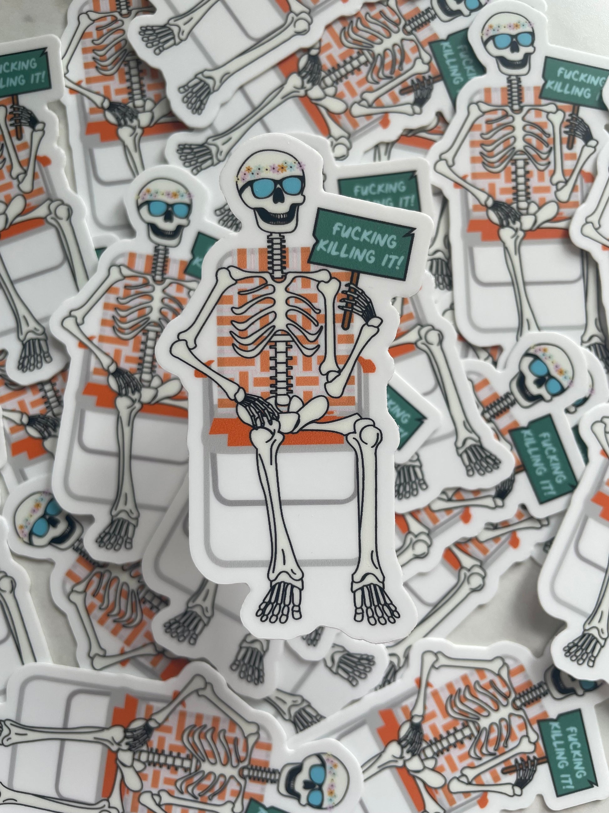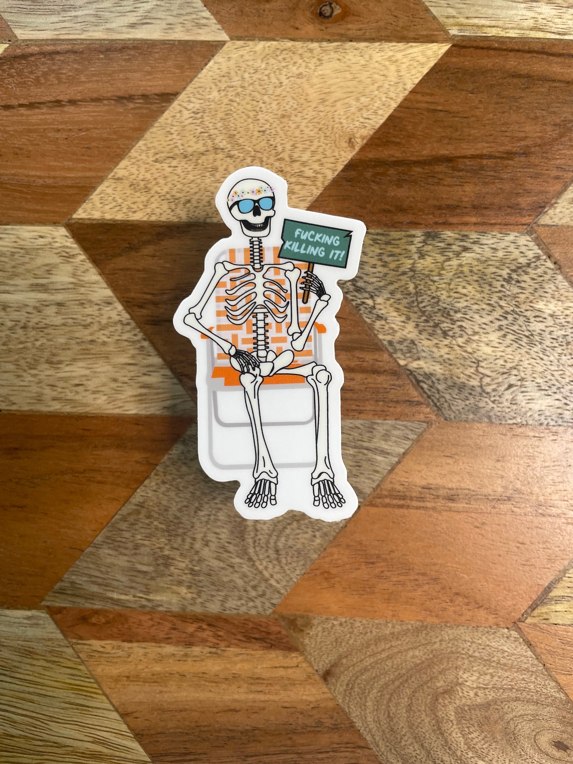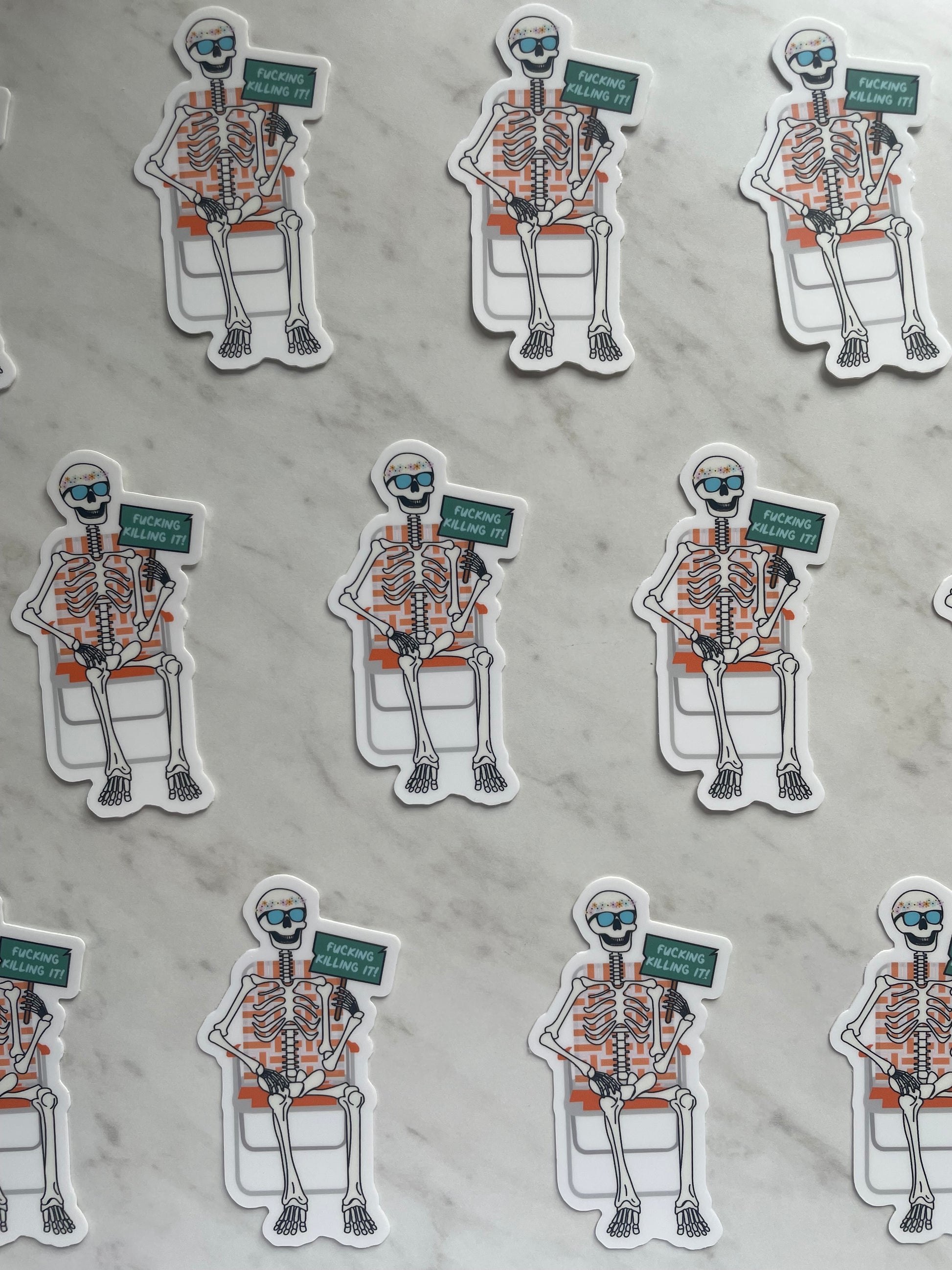 Show off your bold attitude with this playful "Killing It!" sticker featuring a sassy skeleton design. Perfect for adding a touch of edgy fun to your laptop, water bottle, or notebook, it’s a cheeky way to celebrate your unstoppable vibe. Durable and eye-catching, this sticker lets you express confidence with a wink.