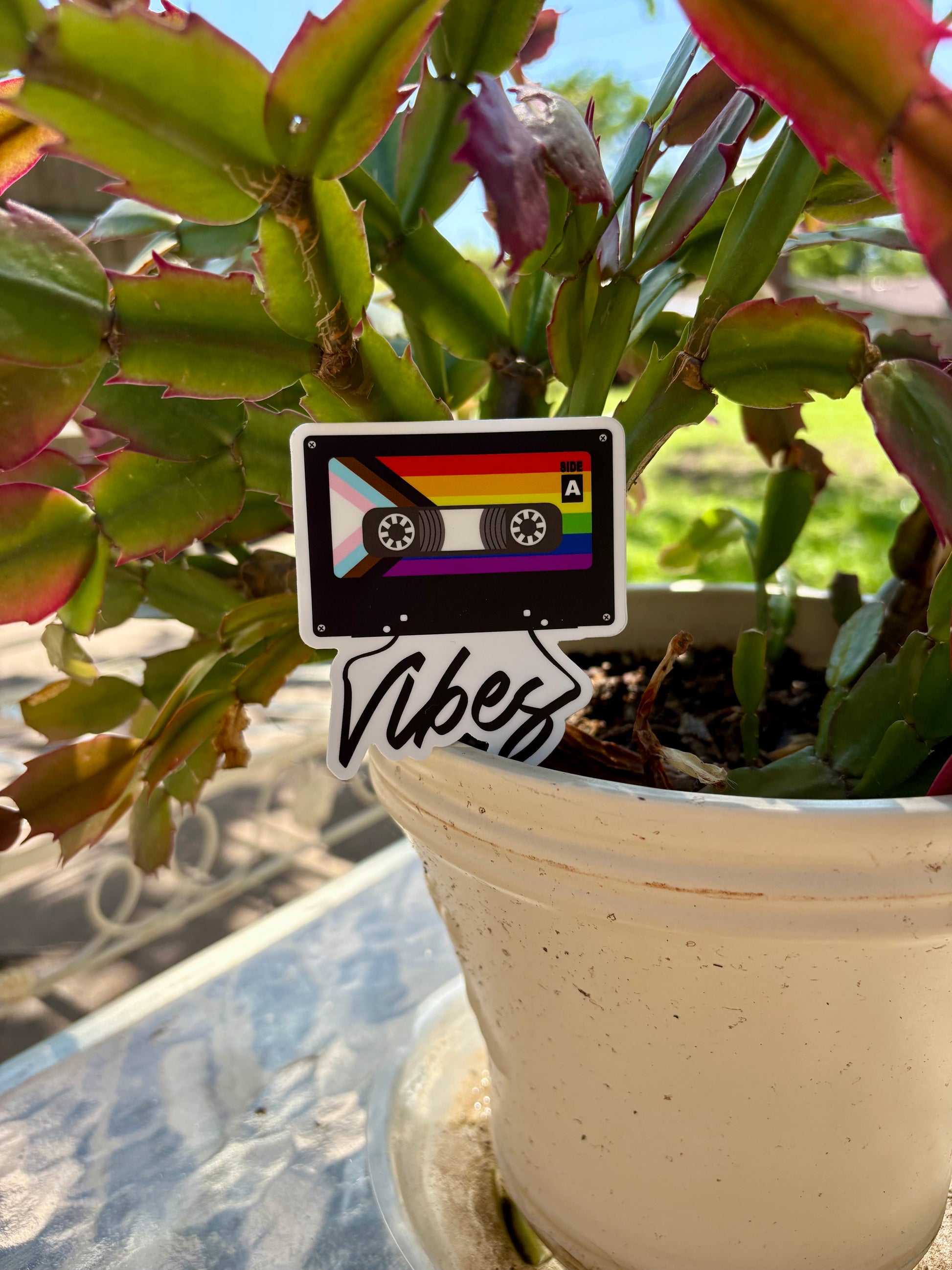 Celebrate your unique style with this playful Pride Vibes Sticker! Featuring a retro cassette tape wrapped in the vibrant colors of the pride flag, it’s perfect for adding a fun, nostalgic touch to your laptop, water bottle, or notebook. Show off your pride and spread good vibes wherever you go!